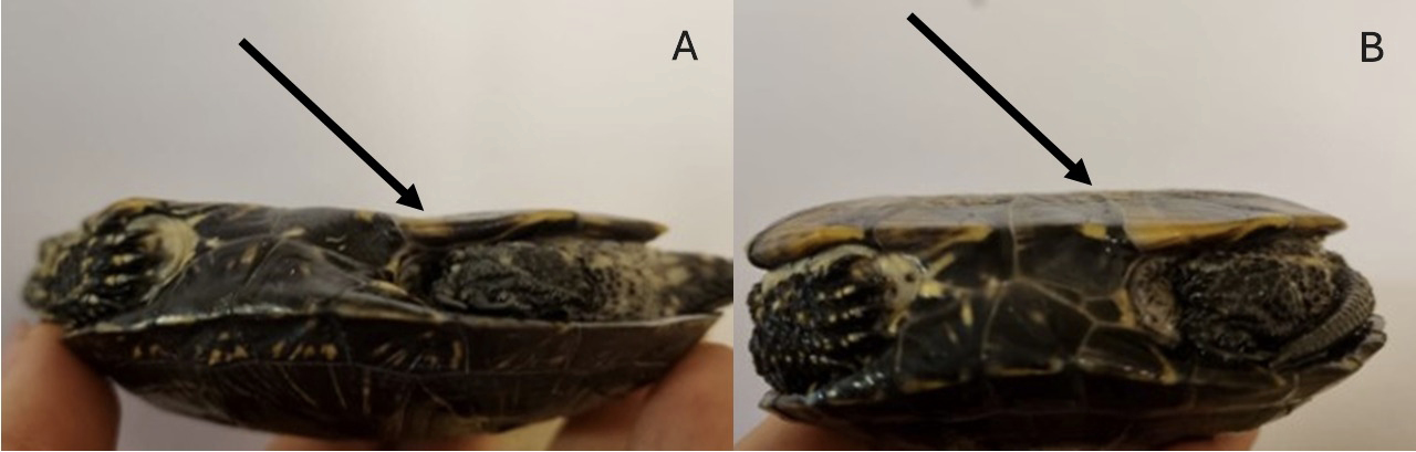 The gender of the reared turtle was determined by the concavity of the lower part of the plastron: females have a flat (smooth) section of the lower plastron, whereas males have a slightly concave posterior part of the plastron (Fig. 1). While other methods exist for determining the sex of turtles, such as the colour of the iris or the length of the nails (Avanzi and Millfanti, 2003; Berthomieu and Vermeer, 2021), these methods are unreliable due to the young age of the turtles.