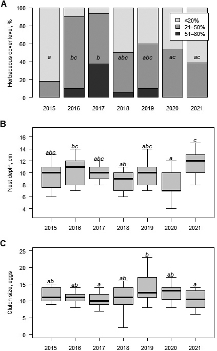 All contingency tables (annual variation in nesting herbaceous cover level; incubation treatment-wise hatching success and survival, as well as overall and treatment-wise sex ratio) were tested using Chi-squared tests. The annual variation in nesting depth and clutch size were analysed using one-way ANOVAs.