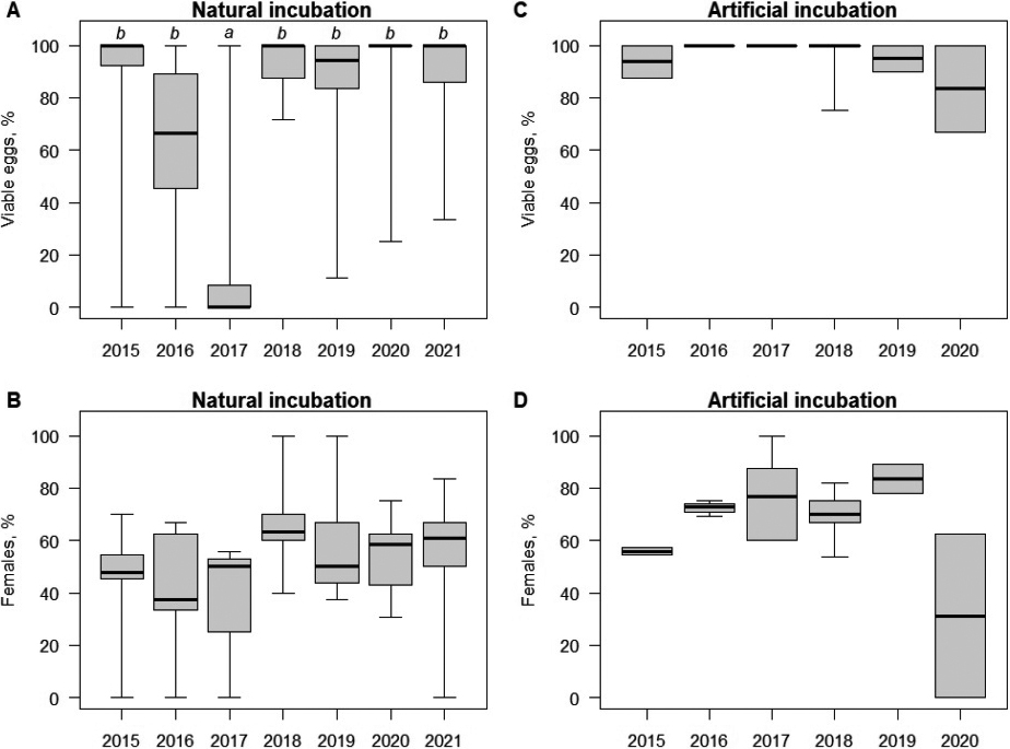 Artificially incubated eggs generally hatch more successfully (Chi-squared test: χ21 = 60.1, p < 0.001) and exhibit a significant female-skewed sex ratio (Chi-squared test: χ21 = 15.9, p < 0.001). After accounting for the random year effect, both differences remained significant (beta binomial GLMM for hatching success per fertilised clutch and binomial GLMM for female percentage per viable clutch: P ≤ 0.0018).