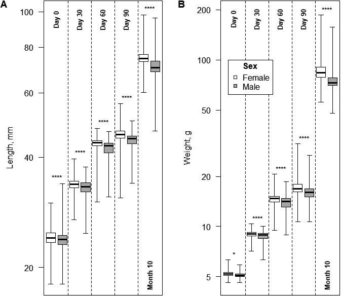 A total of 957 hatchlings were taken for further artificial rearing: 704 were of natural origin, while 253 were of artificial incubation. Twelve deaths occurred: 10 of natural origin (one upon hatching and nine before the 300-day measurement) and 2 of artificial incubation (both before the 300-day measurement). The mortality during rearing was low (1.2%) and did not differ between the two treatments (Chi-squared test: χ21 = 0.54, P = 0.46). Further growth analyses were conducted using only data from surviving turtles. It is noteworthy that even at the egg stage, “female” eggs were significantly heavier than “male” eggs (LMM: F1, 224 = 5.6, P = 0.019), after accounting for the significant random effect of clutch (P < 0.001). Both random effects of turtle and clutch were significant in terms of turtle length and weight (p < 0.001) (the nesting random year factor was insignificant (p = 0.8) and thus removed).