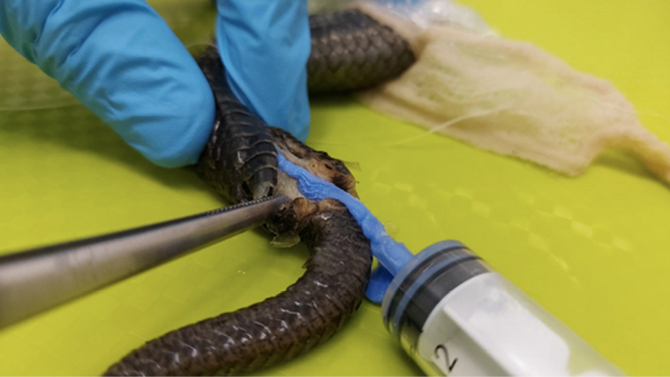 For the preparation of the genitalia models, we followed a methodology proposed by Granados et al. (2022) with a few adjustments and changes, such as not tying the oviducts or the intestine immediately after the cloaca, but further, in order to receive additional information about key structures, and not removing the cloaca from the individual. Each specimen was securely tied approximately 5-6 cm anterior to the cloacal opening to ensure the silicone enters the vaginal pouch first and does not spread to the abdomen and intestines. We used Stomaflex™ Light as a solid silicone component and Stomaflex™ Gel Catalyst to harden the solid component. Each filling hardened for 3-5 minutes, after which a small incision was made at the base of the cloacal opening, followed by removal of the silicone model (Fig. 1). The models were washed with water and kept in plastic tubes. The snake specimens were also washed with water and re-preserved in 90% ethanol.