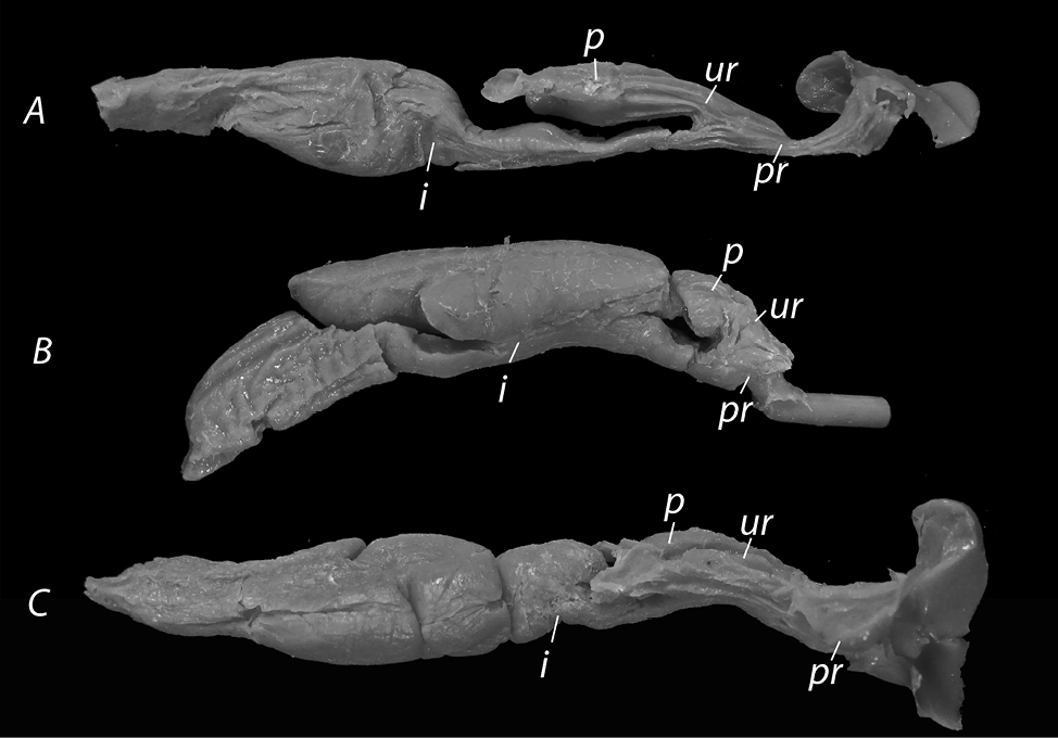 For the description of the female genitalia, we follow (with some additions) the terminology adopted by Siegel et al. (2011, 2012) where the bifurcated cloacal area, that receives the distal part of the hemipenis, is named “vaginal pouch” (or only “pouch”). Considering that Seigel et al. (2011, 2012) describe the states of bifurcation of the pouch histologically, while we observe them only morphologically, we do not follow the four-state categorization of the pouches (bifurcated pouch, separated pouch arms with no urodaeal divide, separated pouch arms with urodaeal divide, and simple pouch), but classify them as follows: simple – no bifurcation, slightly separated – when the silicone model arms are less than 25% of the total model length, separated – when the model arms are between 25%-50% of the total model length, and bifurcated – when the model arms are more than 50% of the total model length. This classification has a close resemblance to the respective term for the general shape of hemipenes, allowing the comparisons to be as accurate as possible. For the description of hemipenes, we followed Andonov et al. (2017), where the terminology is mainly based on Dowling and Savage (1960) and Zaher (1999) with a few additions and clarifications. Following the characteristic for male genitalia introduced in Andonov et al. (2017) – hemipenial proportion index (HPI), we suggest a similar index for the female genitalia description – female genital proportion index (FGPI) where the maximal width of the silicone model is divided by its total length. Female genitalia models with FGPI>0.5 were considered “stubby”; those with FGPI between 0.5 and 0.25— “medium formed”; those with FGPI< 0.25— “elongated”.