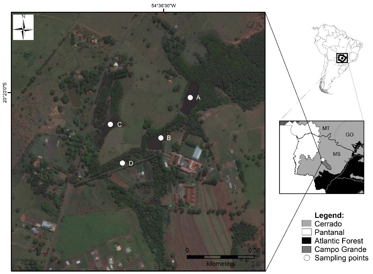Among the four water bodies sampled at the headwaters of the Segredo stream, three are artificial dams (A, B and C) and one is a natural pond (D) that remained with water during the entire study period. The area of the water bodies, estimated using Google® Earth Pro software, ranged from 6,542 m² to 9,171 m², are located in the Cerrado. The surrounding matrix is formed by floodable riparian forest and campo sujo, with tree and shrub vegetation, also containing exotic plant species (e.g., bamboo, eucalyptus, and mango trees). The margin and the interior of the water bodies present vegetation cover by herbaceous and aquatic plants and the substrate is sandy or clayey (Table 1). Despite being located in an area of urban expansion, none of the water bodies receive sewage effluents.