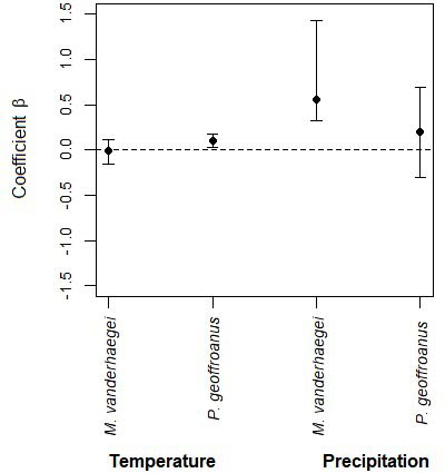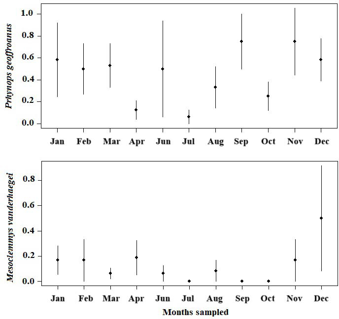 The abundance of M. vanderhaegei and P. geoffroanus varied among water bodies, across sampling months, and also considering the interaction between these two factors (Table 4; Fig. 4, 5). However, the average daily temperature influenced abundance only for M. vanderhaegei (X² = 22.676, df = 2, P < 0.001; Table 4). When both species were modeled together, the average daily temperature also did not have a significant effect on species abundance (X² = 3.3153, df = 1, P = 0.068; Table 4). The variation in abundance over the sampling months was different for P. geoffroanus and M. vanderhaegei, with high capture rates in the wettest and warmest months of the year for P. geoffroanus (November, December, January, February, and March) (Fig. 4). For both species, no new individuals were captured in May (Fig. 4).