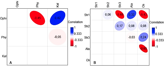 Covariation between abundances of ME parasitizing the same organ did not show a clear pattern, and the correlation coefficients were generally weak and not statistically significant (Fig. 4). Two pairs of larval mesenterial ME (Oligacanthorhynchus sp. – Alaria sp., Strigea sp. 1 – Strigea sp. 3), and two pairs of ME from the digestive system (O. joanae – Physaloptera sp., K. appendiculatus – Physaloptera sp.) had negative correlation coefficients. Contrastingly, in three pairs of larval mesenterial ME (Oligacanthorhynchus sp. – Strigea sp. 3, Strigea sp. 2 – Strigea sp. 3, Alaria sp. – Strigea sp. 1), and one pair of ME from the digestive system (K. appendiculatus – O. joanae), the correlation coefficients were positive.