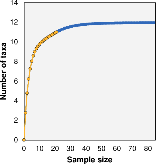 The estimated number of taxa for our sample size was 11 taxa, with an expected richness of 11.95 taxa based on the Chao-2 index (Fig. 5). This estimate reached 92.1% of the potential taxa that could be detected with a large sample size.