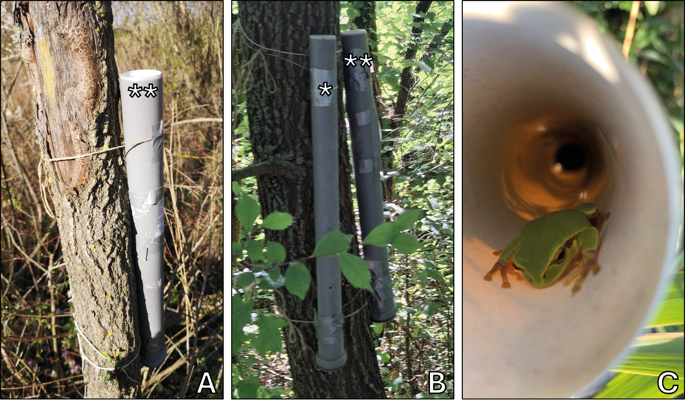 To address sampling this species during the non-breeding season, several approaches have been used. For example, Pellet et al. (2006) employed harmonic direction finders to track individual movements. Others, such as Kovács et al. (2007), searched directly for frogs in shrubs and trees within wetland areas to investigate diet and microhabitat use. However, such methods can be time-consuming or logistically demanding, limiting their applicability for regular monitoring. Artificial shelters – particularly polyvinyl chloride (PVC) or bamboo pipe shelters that mimic natural hiding places of hylids – have been proposed as an efficient and non-invasive alternative (Boughton et al., 2000; Bartareau, 2004; Myers et al., 2007; Johnson et al., 2008; Moulton et al., 2009; do Vale et al., 2018). This method has been proven useful in both ecological (Mahan and Johnson, 2007; Liner et al., 2008; Campbell et al., 2010; McGhee, 2020) and conservation contexts (Schurbon and Fauth, 2003; Wyatt and Forys, 2004; Suriyamongkol et al., 2021). Furthermore, it has also been explored as a tool for microhabitat creation or threat mitigation for amphibians and other vertebrates (Cowan et al., 2021; Suriyamongkol et al., 2021).