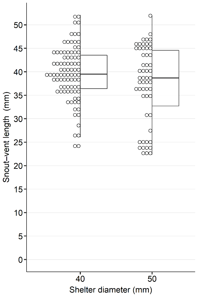Snout–vent length (SVL) was measured for a total of 142 frog captures at paired shelter sites, while 26 captures were not measured (see Materials and methods). In 40-mm diameter shelters (N = 87), SVL ranged from 24.1 mm to 52.1 mm (mean ± SD = 39.6 ± 5.8 mm; median SVL 39.5 mm; Fig. 3). In 50-mm diameter shelters (N = 55), SVL ranged from 22.4 mm to 51.9 mm (mean ± SD = 37.3 ± 8.3 mm; median = 38.7 mm; Fig. 3). Snout-vent length data deviated from a normal distribution (Shapiro–Wilk test: W = 0.951, P < 0.001), and no significant difference in body size was found between shelter diameters (Wilcoxon rank-sum test: W = 2652, P = 0.278).