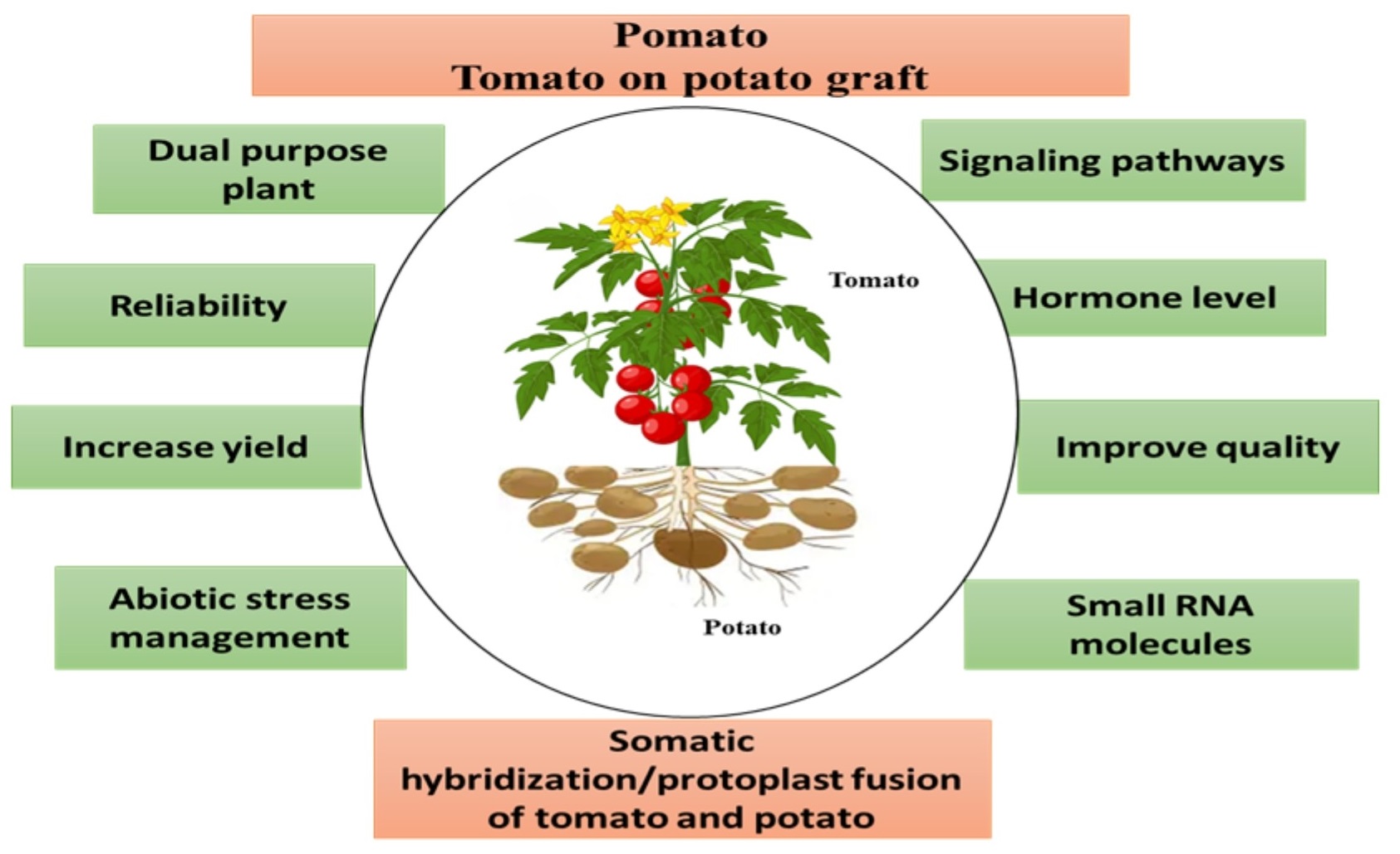 Pomato is the result of a combination of a tomato scion and a potato rootstock. This grafted combination is also acknowledged as a horticultural magic plant, a recombinant double harvest plant, or a chimeric double harvest plant. This type of plant could meet the need for proper vertical resource usage in the future, as urbanization is increasing rapidly and agricultural land is now becoming rare and expensive. Moreover, even though changes in the environment are the most substantial real limitation in vegetable production, this category of graft could be employed as an alternative strategy. Few reports on using somatic interbreeding to establish tomato-potato fusion hybrids have been available since the early 1900s. This strategy can be used again in the future to save time and convenience during labor-intensive procedures, as this plant can indeed be established through any other technique, instead of trying to make grafting and somatic combination the only reasonable alternatives. The grafted union of tomato and potato has indeed positively influenced output, reliability, hormone levels, signaling pathways, and mechanisms. This paper has been reviewed to gather all information available on the tomato plant to date, since there has been some experimentation over the past few decades.