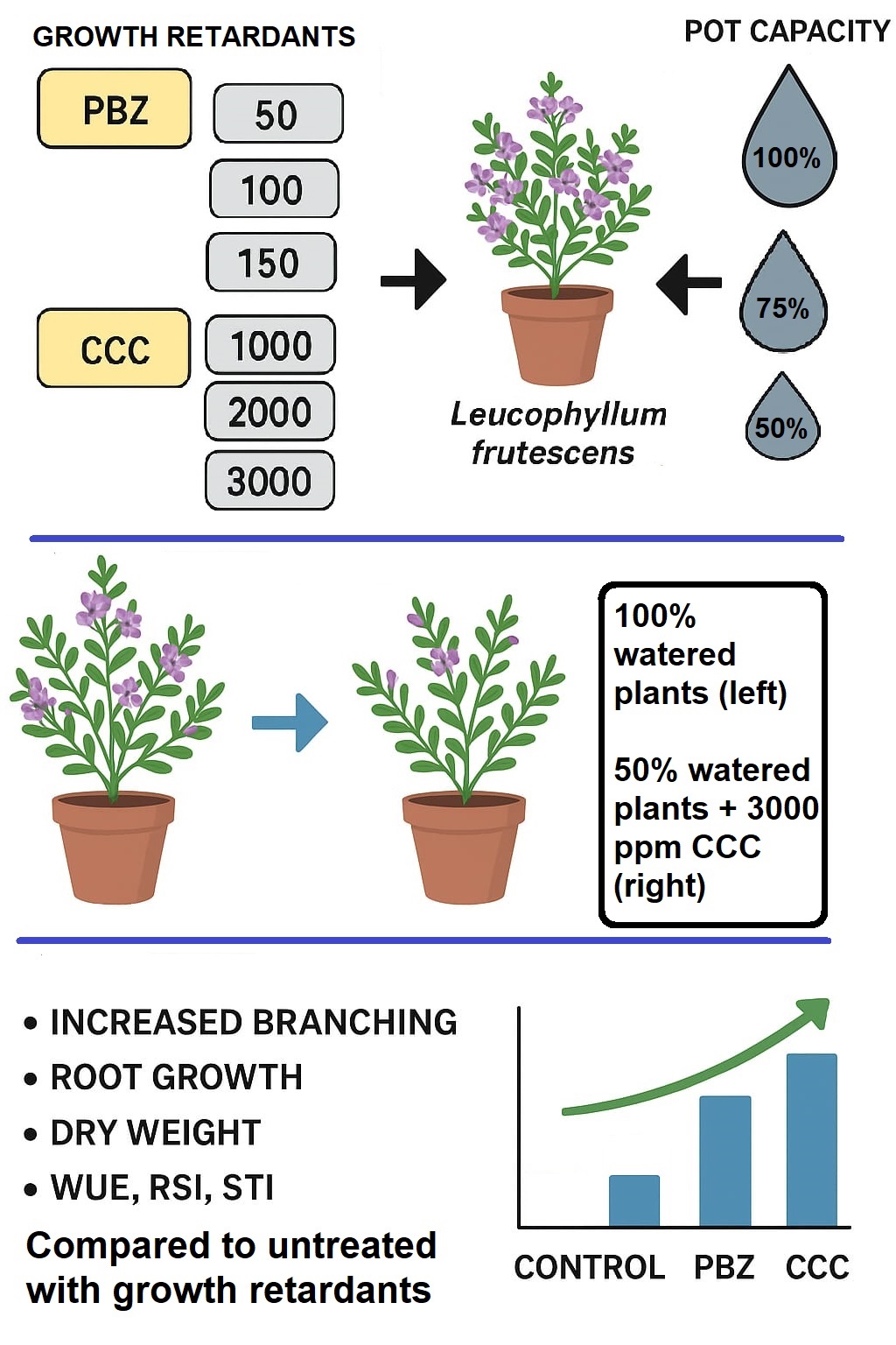 Leucophyllum frutescens is an evergreen shrub renowned for its drought tolerance. Paclobutrazol (PBZ) and cycocel (CCC) growth retardants were applied as foliar spray on L. frutescens plants cultivated in pots to assay the possibility of increasing these plants’ tolerance to water stress while maintaining high quality. The experiment was accomplished under full sun in the open field of the Nursery of Ornamental Plants and Landscape Gardening Res. Dept., Hort. Res. Inst., ARC, Egypt during the 2022 and 2023 seasons. Different concentrations of PBZ at 50, 100 and 150 ppm and CCC at 1000, 2000 and 3000 ppm were combined with 100, 75 and 50% pot capacity (P.C.) irrigation water levels, and some morphological, chemical and tolerance indices were examined. The obtained results showed a great reduction in all studied parameters except for proline content due to reduced irrigation levels. All growth retardants applied increased the values over control except for plant height and fresh weight of 10 flowers. Regarding the interaction treatments, the highest concentration of PBZ (150 ppm) and CCC (3000) produced the highest values in most cases when combined with both 75 and 50% irrigation water levels. Such treatments increased the number of main and lateral branches/plant, fresh and dry weights of vegetative growth and roots and root length, while mediated values were obtained for chemical constituents. Water use efficiency, relative stress index and stress tolerance index are also, greatly enhanced by such treatments. Cycocel at 3000 ppm could be recommended to treat Leucophyllum frutescens plants cultivated in 30 cm pots and subjected to only 50% irrigation water level as this treatment demonstrated good performance with high stress tolerance index to drought.