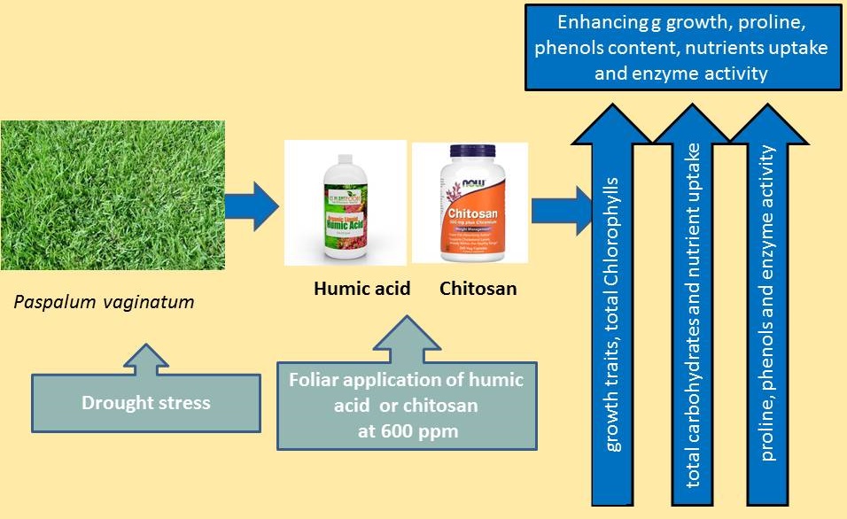 The current study was carried out to examine the impact of humic acid or chitosan applications on morphology and physiology attributes of Paspalum vaginatum Swartz. cv. Salam grown under drought stress. Drought stress was enforced by various watering intervals (2, 5, 8 and 11). The plants subjected to various watering intervals were sprayed biweekly with either humic acid (HA) or chitosan (CHT) each at concentrations of 300 and 600 ppm, whereas the tap water was used as control. The findings indicated that drought stress decreased all growth traits (such as, sward height, lawn density and dry weights of clippings and underground parts), total chlorophylls, total carbohydrates, N, P and K%, while proline, phenols content and Enzyme activity (CAT, APX and SOD) were raised. The plants foliar sprayed with HA or CHT at higher doses led to boost in the tested growth traits, total chlorophylls, total carbohydrates, N, P and K%, proline, phenols and enzyme activity with superiority of HA. Based on the outcome of the present research it can be inferred that, foliar application of HA at 600 ppm can ameliorates the harmful impacts of drought stress on physiology and growth traits of Paspalum vaginatum.