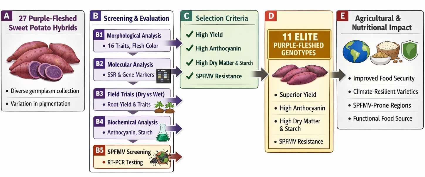 Sweet potato, a top five global crop with over 95% of production in developing countries, surpasses wheat, rice, and cassava in yield, nutrition, adaptability, and stress tolerance, providing more edible energy per hectare and contributing significantly to food security. Purple-fleshed sweet potatoes (PFSP) have a rich, deep purple color due to the presence of anthocyanins, which are antioxidants that have numerous health benefits. The flavor is like other sweet potatoes but can have a slightly more earthy or nutty taste, depending on the variety. Purple sweet potatoes are nutritious, being high in fiber, vitamins, and antioxidants. They can be used in various dishes, from baked and mashed forms to soups, fries, and even desserts. Molecular characterization, using SSR markers, indicated significant genetic diversity among the genotypes. Specific markers for the types of anthocyanin and resistance to Sweet potato Feathery Mottle Virus (SPFMV) were utilized to screen for promising lines. Yield trials conducted over multiple seasons showed notable differences in root count and weight, with purple-fleshed genotypes generally outperforming others, particularly during the dry season. Biochemical analysis further confirmed the high anthocyanin content in these purple-fleshed varieties, which also exhibited better yields during the dry season. Fifteen high-yielding genotypes were screened for resistance to SPFMV. The results, confirmed by SPFMV2-specific markers, showed that these genotypes were tolerant to the virus. Despite the virus’s presence, these genotypes continued to perform well, making them strong candidates for cultivation in regions affected by SPFMV. Based on their morphological traits, yield performance, biochemical properties, and virus resistance, 11 purple-fleshed genotypes were identified as top performers. These genotypes hold great potential for improving sweet potato production and food security in developing countries, where they can contribute to increased yields, enhanced nutritional value, and greater resilience to viral diseases.