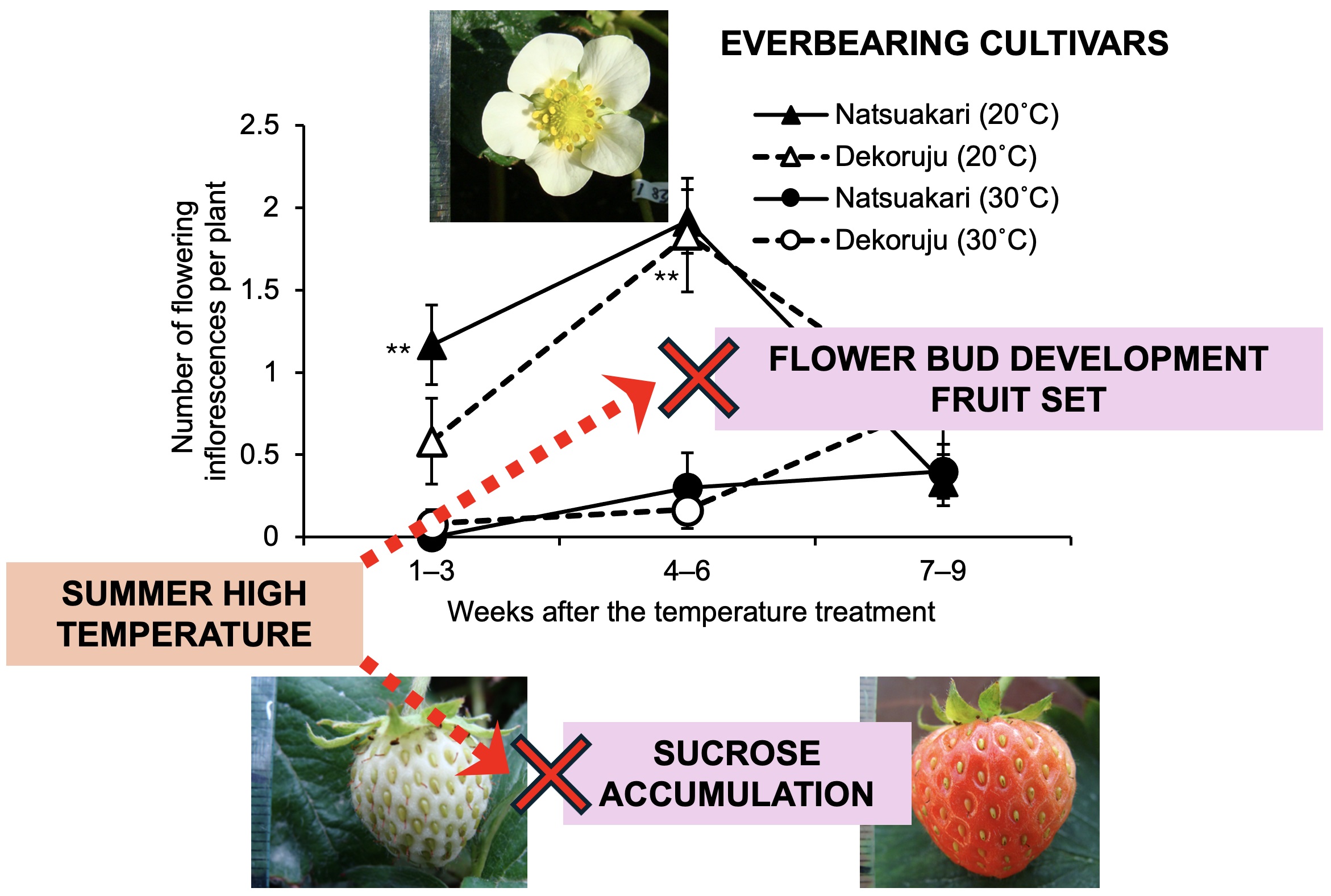 In everbearing strawberry cultivars, understanding the effects of high temperature is crucial. Long-day everbearing cultivars are promoted for summer and autumn production whereas this is off-season for June-bearing varieties. This study investigated the effects of high temperature on the development and fruit quality of the everbearing cultivars Natsuakari and Dekoruju in a phytotron-simulating summer condition. Both cultivars showed a smaller number of flowering inflorescences at 30°C/25°C (day/night) compared to 20°C/15°C, indicating that flower bud development is sensitive to high temperatures. Fruit set rates were also negatively affected by the higher temperature. Fruit sugar composition of ‘Natsuakari’ fruits showed an increased sucrose concentration during the developmental stage from 75% colored fruit to 100% colored fruit. In the ripe fruit of ‘Natsuakari,’ the sugar content was measured higher due to greater amount of sucrose accumulation, whereas a remarkable decrease in the sucrose concentration was observed at 30°C/25°C temperature compared to 20°C/15°C. These results suggested that summer high temperatures negatively impacted flowering, fruit set, and sucrose content in everbearing cultivars, ultimately leading to reduced fruit production and quality. Additionally, the temperature effects varied between the two cultivars strawberry.