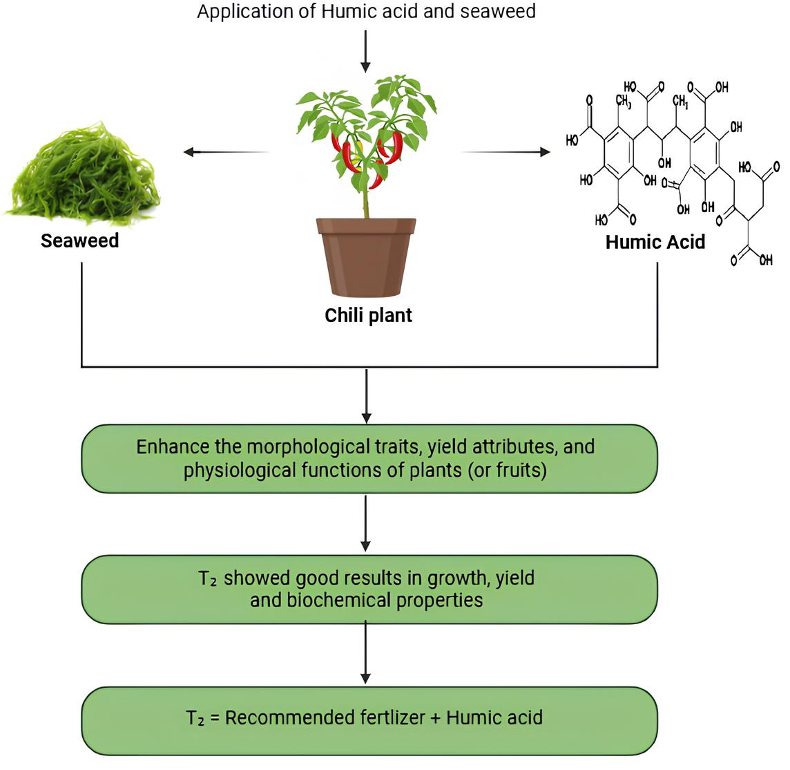 Chilli is a significant horticultural crop in Bangladesh, contributing to spice production and the rural economy. This investigation aimed to evaluate the effect of humic acid and seaweed extracts as bio-stimulants on plant growth, yield, and biochemical properties of chilli (var. Hira 1701 Supreme). There were four treatments in this research: T0 (control), T1 (recommended fertilizer + humic acid), T2 (recommended fertilizer + seaweed extract), and T3 (recommended fertilizer + both seaweed extract and humic acid). The results indicated that T2 possessed the highest values in the most studied parameters, including plant height (60.13 cm), number of leaves (98.75), number of branches (13.25), number of flowers (37.63), fruit length (7.92 cm), seeds per fruit (79.75), yield per plot (1156.5 g), yield per hectare (7.23 ton), plant fresh weight (187.50 g⁻¹ Plant), plant dry weight (41.00 g⁻¹ Plant), vitamin C (177.80 mg 100 g⁻¹ FW), total phenolic content (164.87 mg 100 g⁻¹ FW), total flavonoid content (35.95 mg 100 g⁻¹ FW), crude protein content (8.63%), and total soluble solids content (5.80 °Brix). While T1 and T3 also performed better than the control (T0), T2 consistently outperformed all other treatments. Correlation analysis revealed strong positive associations among yield, plant physiology, and key biochemical traits, indicating their interdependence. Moreover, PCA-based biplot analysis clearly separated the treatments and confirmed that T2 showed a strong correlation with enhanced agronomic performance and superior nutritional quality. These findings show that seaweed extract foliar spray with the recommended fertilizer is superior to humic acid alone for enhancing chilli growth, productivity,
