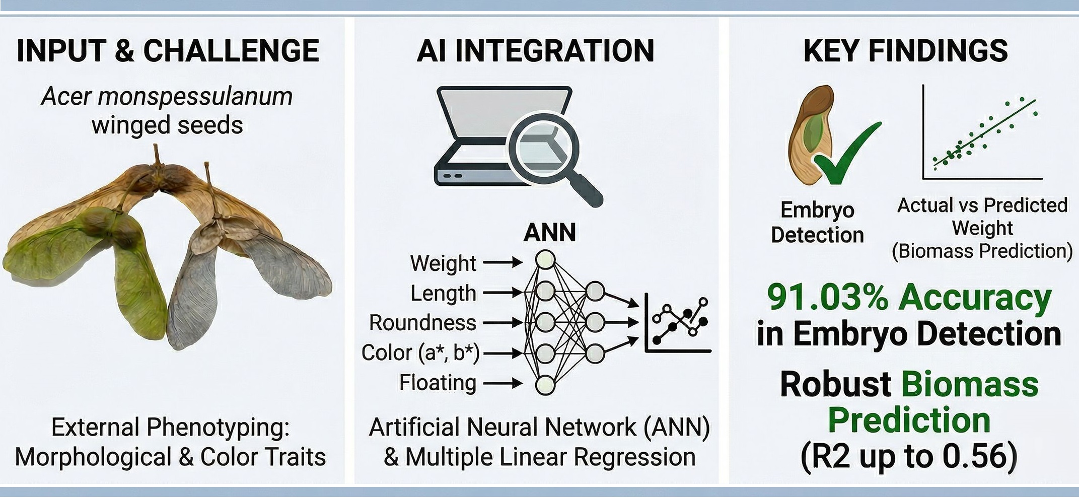 This study aimed to develop a non-destructive method for predicting embryo presence and quantifying embryo biomass in Acer monspessulanum seeds using morphological and physical traits, combined with machine learning and statistical modeling approaches. Seeds were divided into two groups based on the presence or absence of embryos, and 26 morphological and physical traits were measured. Welch’s t-tests were used to identify traits significantly differed between seeds with and without embryos. A feedforward neural network classifier was trained on these traits to predict embryo presence. Additionally, forward stepwise regression models were constructed to identify key predictors of embryo fresh weight, dry weight, and water content in embryo‐containingseeds. Statistically significant differences (p<0.05) were observed between embryo- containing and empty seeds in traits such as seed weight, length, roundness, Hue, and floating behavior. The neural network classifier achieved 91.03% accuracy, with strong precision (0.92) and recall (0.94) for identifying embryo‐containing seeds. Regression models explained up to 56% of the variation in embryo dry weight and 50% in fresh weight, with seed weight, color parameters, and floatation traits emerging as primary predictors. Embryo water content was primarily predicted by the b* seed coat color parameter (31.6% variance), with additional contributions from buoyancy, perimeter, and post- scarification color traits, yielding a model explaining 45.5% of total variation. The integration of seed phenotyping with neural networks and multiple linear analysis provides a robust, non-destructive method for classifying embryo‐containing seed and predicting embryo development in Acer monspessulanum. This approach offers valuable applications in reforestation, seed banking, and ecological restoration initiatives.