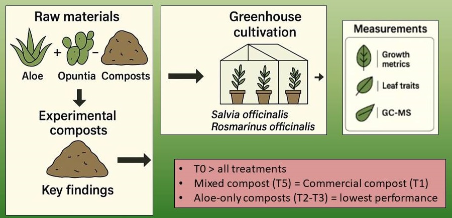 The sustainable cultivation of medicinal and aromatic plants requires alternative substrates that reduce dependence on peat and synthetic fertilisers, while promoting acceptable plant growth and adequate phytochemical quality. This study evaluated the effects of five compost treatments on Salvia officinalis and Rosmarinus officinalis grown in greenhouses at CREA (Pescia, Italy). The treatments examined in this study include use of a peat-based control, commercial compost, monospecific composts derived from Aloe arborescens, Aloe barbadensis and Opuntia ficus-indica, plus a mixed Aloe-Opuntia compost. Growth parameters, photosynthetic performance, chlorophyll content, water and resource use efficiency, microbial biomass and secondary metabolites (phenols, flavonoids, essential oils) for both species were evaluated. For both species tested, the peat-based control supported consistently the best vegetative growth, highest phytochemical levels and was confirmed to be the best for physical support in greenhouse conditions. The mixed Aloe-Opuntia compost functioned similarly to the peat-based control, yet it showed a 5-8% reduction in vegetative growth, however, it still had a higher physiological/metabolic level than other compost based treatments. The results indicate that it is possible to use composts containing a combination of materials with complementary structural and biochemical properties to help overcome some of the limitations of single-species composts. On the other hand, composts made from Aloe vera alone exhibited the weakest agronomic and physiological performances likely due to having a higher electrical conductivity, high rapid decomposition rates, and having a poorly developed substrate structure even though it had a high total nutrient content. There was no difference in the safety of all composts; they caused no negative effects on plant survival, pest infestation, or disease occurrence. Such promising results were recorded particularly for mixed composts, but due to the fact that this was a greenhouse trial, there is a need for further replication to confirm findings. In conclusion, mixed plant composts could be a more sustainable solution, environmentally friendly for producing aromatic plants, and will reduce the reliance on the limited supply of peat.